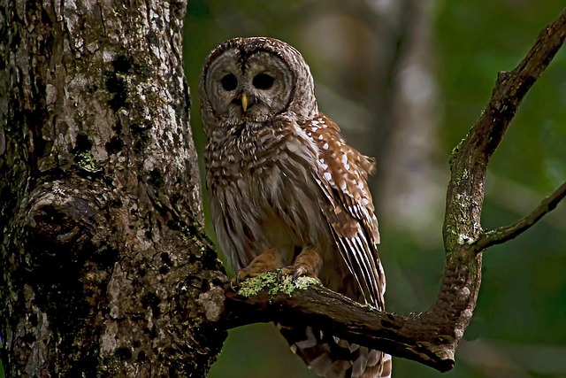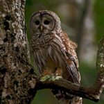 Barred owls are permanent residents throughout New York. They are an attractive owl, with soulful brown eyes and brown-and-white-striped plumage. They tend to be unnoticed as they are eerily quiet flying through the air. The Great Horned Owl is the most serious predatory threat to the Barred Owl. Although the two species often live in the same areas, a Barred Owl will move to another part of its territory when a Great Horned Owl is nearby.